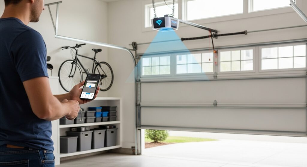 A smart garage door system connects your opener to the internet through Wi-Fi connectivity, allowing remote operation through a mobile app. When properly configured, the garage door wall control, wireless keypad, and remote control transmitter all communicate with the garage door receiver through secure digital signals.